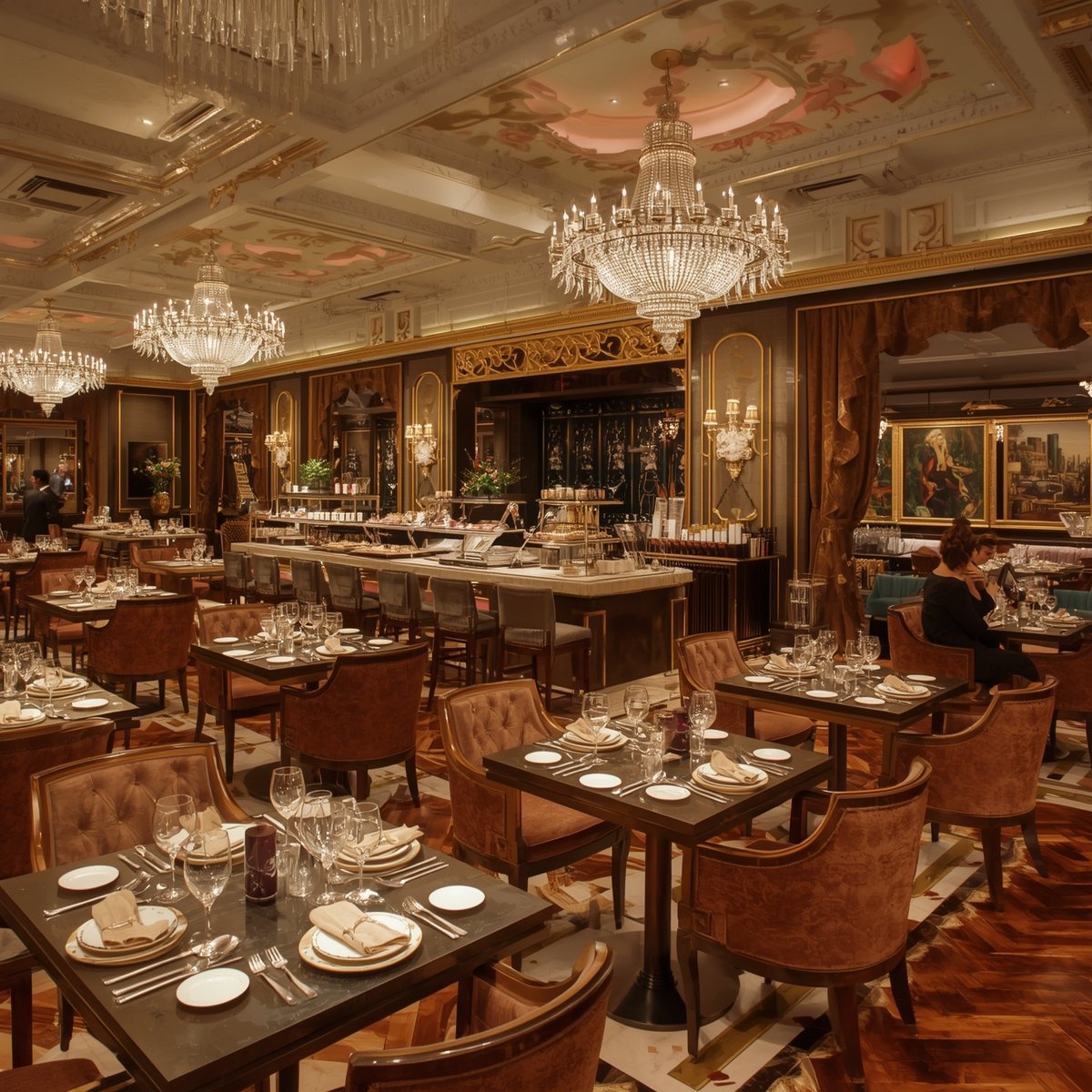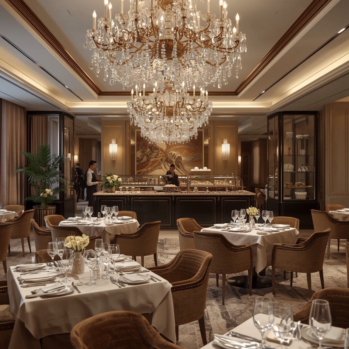A luxurious dining room setting featuring elegantly arranged tables with white tablecloths, gold-colored chairs, and neatly placed tableware. The background showcases a grand fireplace with an ornate clock and large classical paintings adorning the walls.